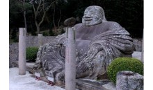 彌勒造像位于瑞巖寺右側(cè),又稱"仁佛".為元至正元年(1341年),本縣人呂伯恭之杰作。及依整塊巖石自然形態(tài),就地鑿成。像高6.4米、寬8.9米、存約8米許,頭部高2.3米、頭頂寬1.8米、耳長(zhǎng)1.3米、嘴寬1.1米、肩寬1.6米。石像盤(pán)腿趺坐,袒 胸 露臍,左手捻珠,右手撫腹,兩眼平視,雙耳垂肩,笑容可掬,生動(dòng)逼真,形神兼?zhèn)?,栩栩如生?/p>